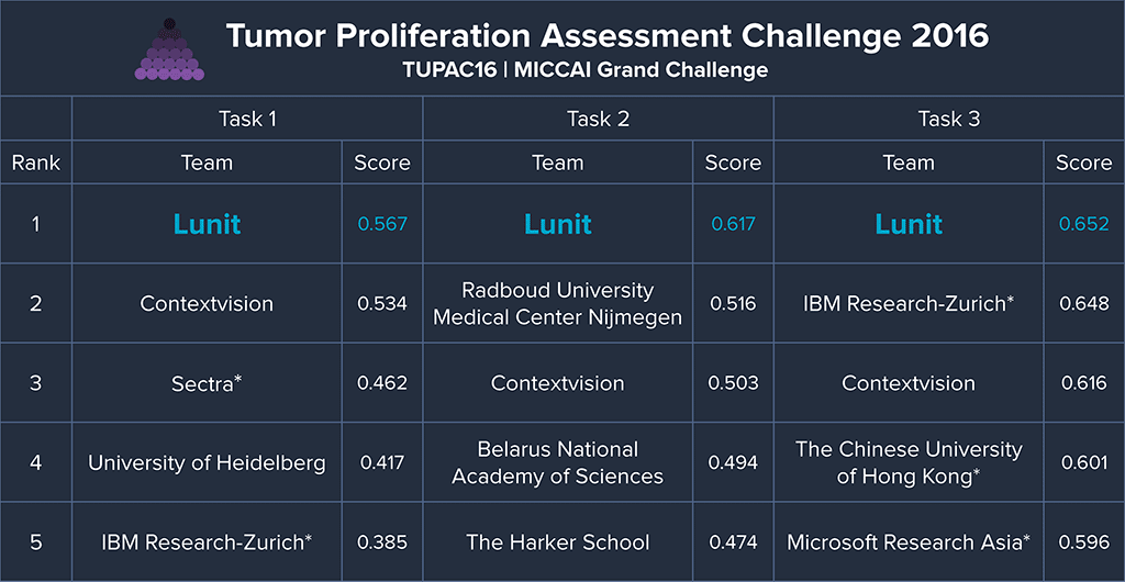 On Oct. 17, Tumor Proliferation Assessment Challenge was held as a satellite event of MICCAI 2016 and Lunit won first place in all of the three tasks in the challenge. Unlike the previous challenges, participants were asked to predict the tumor proliferation score that can be integrated into current prognostic grading systems, being more relevant to actual clinical practice.