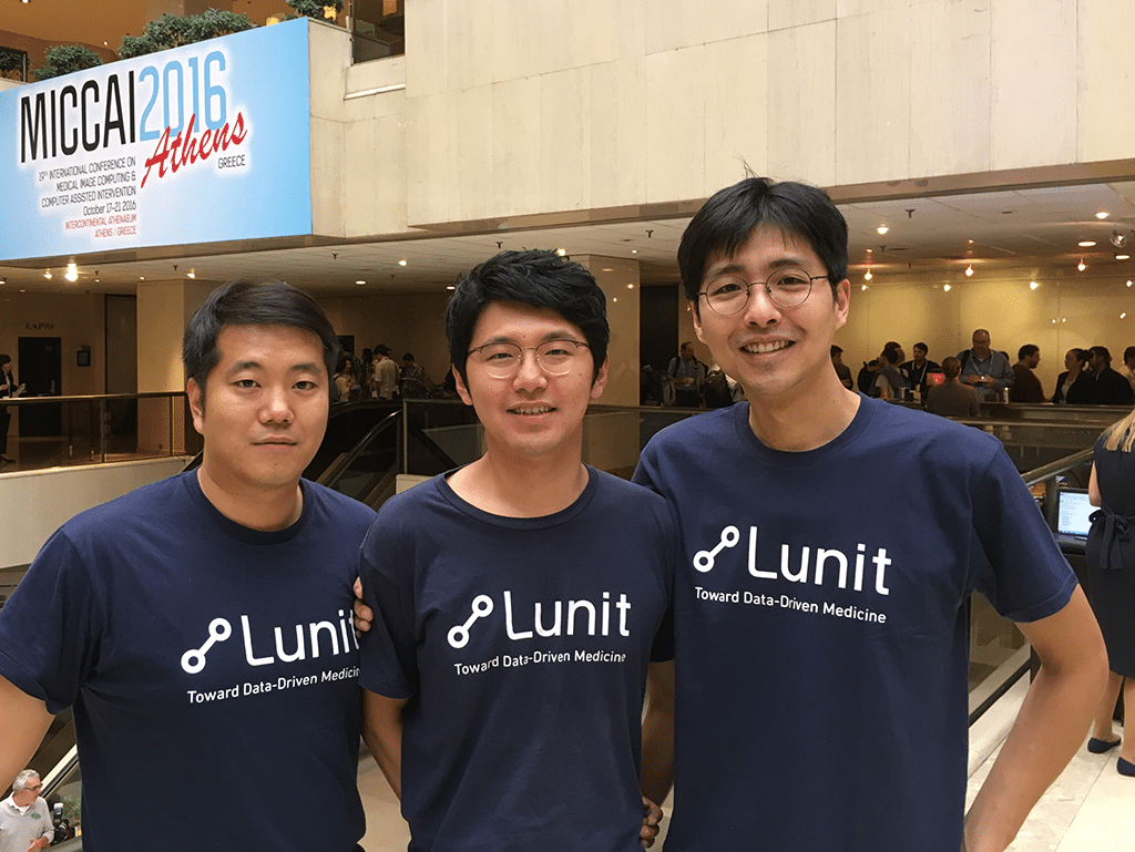Lunit’s researchers at the challenge venue: Sunggyun Park, Kyunghyun Paeng and Sangheum Hwang (from left)